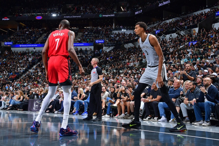 马刺也很聪明,战略性放空奥科吉的底角三分,他们深知无法在防守端面面俱到,上半场让文班亚马单防申京,只包夹杜兰特,分而治之,尽可能让火箭的半射手和角色球员消化球权。